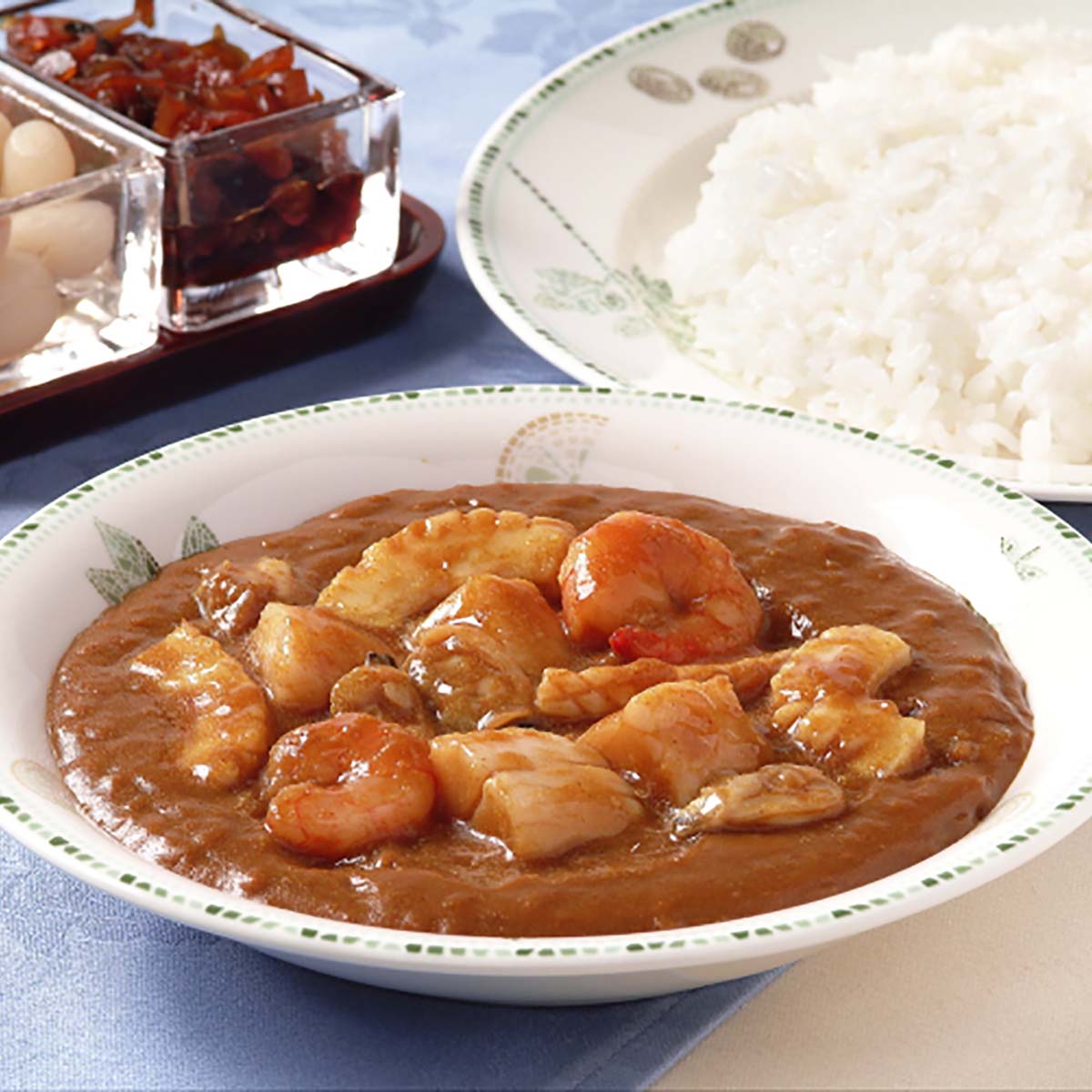 | 魚肉(海老、アサリ、いか)、カレールー(小麦粉、牛脂豚脂混合油脂、ソテー・ド・オニオン、カレー粉、食塩、砂糖、その他(大豆・バナナ・りんごを含む))(国内製造)水煮マッシュルーム、野菜(玉葱、にんにく)、ベイシックトマト(トマト、玉葱、その他)、バター、鶏ガラスープ、小麦粉、マンゴチャツネ、白ワイン、オイスターソース、ビーフパウダー/着色料(カラメル)、調味料(アミノ酸等)、酸味料 | |