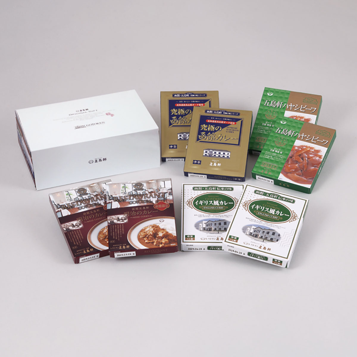 | 究極の函館カレー:294kcal(1箱あたり) 五島軒ハヤシビーフ:292kcal(1箱あたり) 明治のカレー:265kcal(1箱あたり) イギリス風カレー:292kcal(1箱あたり) |