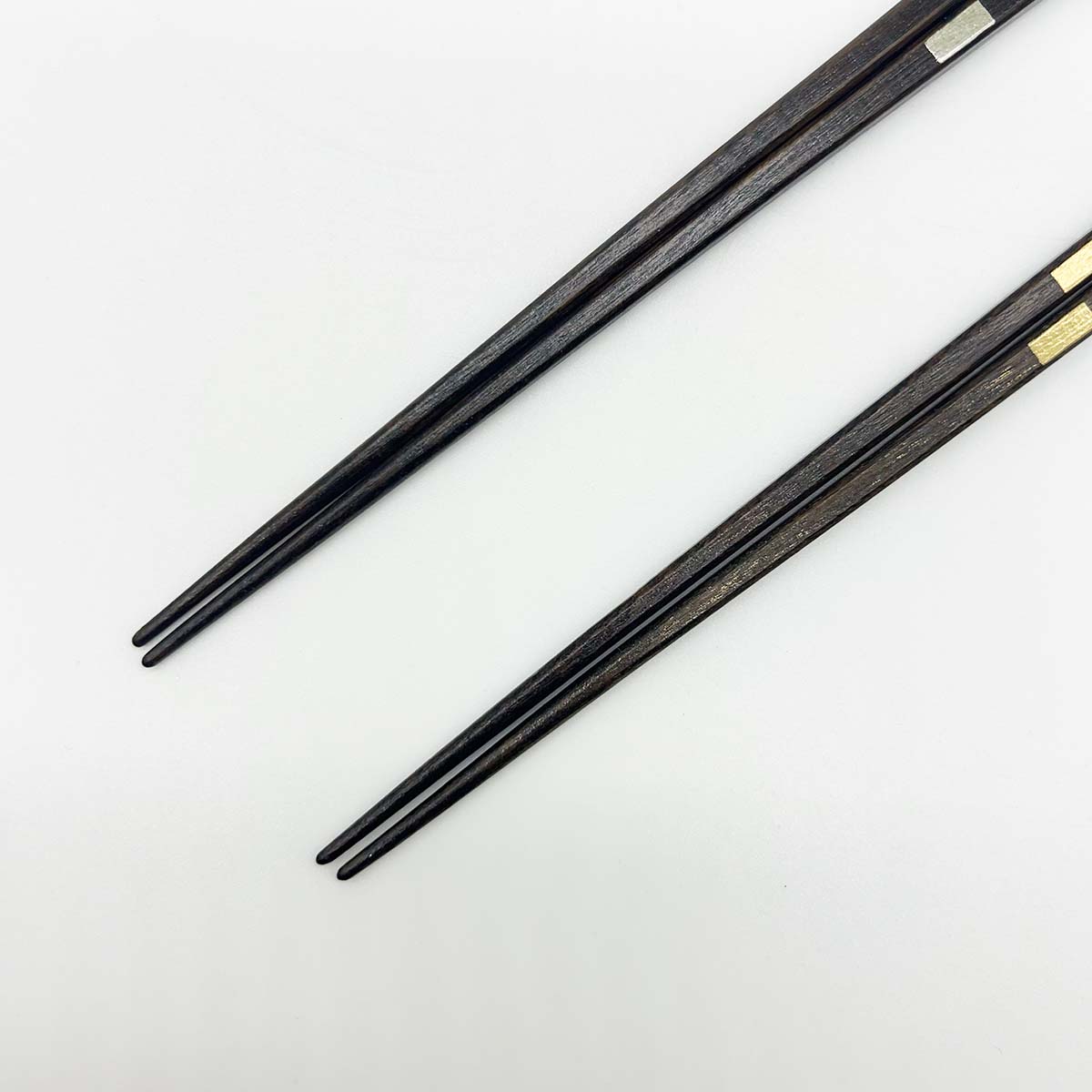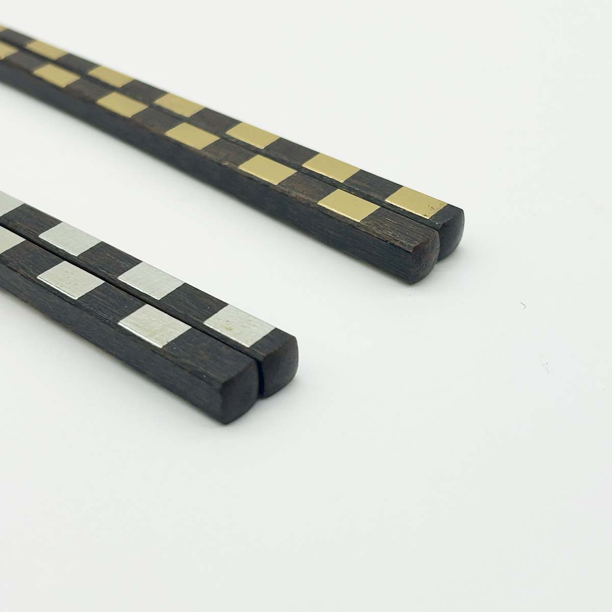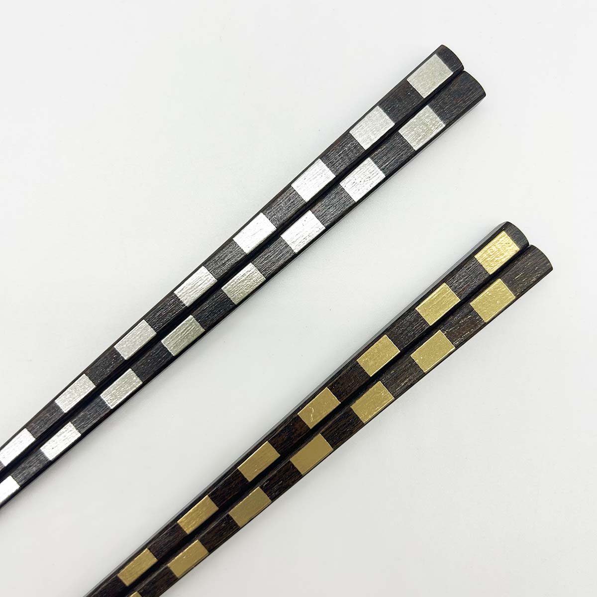 シンプルで堅牢な越前塗のお箸。金銀の市松模様が特徴です。